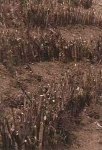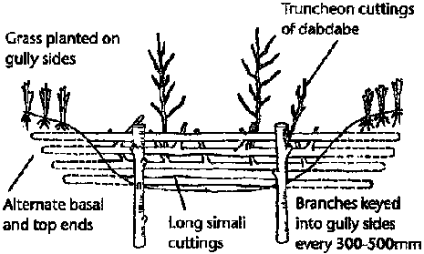 Fences made out of live cuttings are placed across the slope. Debris moving down the slope is trapped behind them. This is a relatively poor technique used to catch material on gentle slopes.