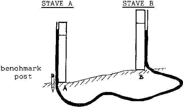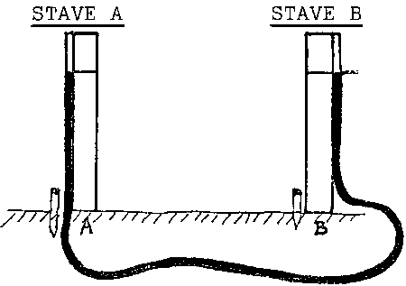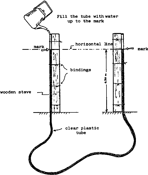 - Put the staves side by side, with the marks on them and the level of the water in the tube at the same level.- Drive a post into the ground in place of the first stave (A).