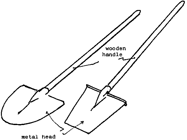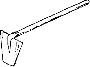 This type of shovel is ideal for digging but is ineffective when it comes to scraping flat surfaces. On soft or sandy ground, a square-mouthed spade is equally useful. This latter type has a wide straight cutting edge. A tread is fitted to the top of the metal head to enable the worker to force the spade into the ground with his foot.