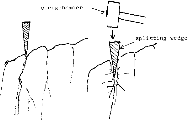 This is simply a forged piece of metal which is used to break up already cracked rock. It has a pointed side which is wedged into a crack and a flat side which is struck with a sledgehammer.