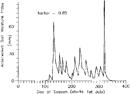 Soil moisture levels can be estimated by accounting procedures that balance the infiltration of rainfall against losses by drainage and evapotranspiration. The calculation of evapotranspiration (Et) by different methods is discussed in Chapter 8. A commonly used accounting procedure derives an Antecedent Precipitation Index, by the application of an estimated factor for Et losses on previous rainfall. It is generally assumed that the rate of reduction of the soil moisture reserves is logarithmic, the rate falling as the availability of water decreases. The mechanisms by which antecedent soil moisture effects runoff are highly variable from soil to soil, but the general assumption equates higher proportions of runoff with higher levels of soil moisture. This reflects the behaviour of infiltration rates under increasingly moist conditions. Figure 6.12 illustrates changes in antecedent soil moisture according to rainfall.