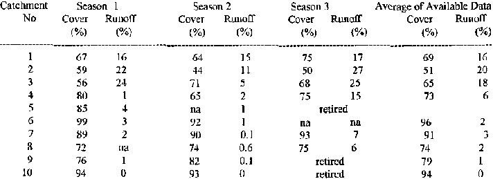 Natural vegetation can be very important in determining runoff amounts; in many instances it is the most important influence of all, after rainfall. Areas bare of vegetation can lose more than 40% of seasonal rainfall through runoff and for intense, individual storms the loss can be much greater. Areas with dense grass cover and tree canopy cover can retain as much as 99% of the rainfall that reaches the ground. Vegetation reduces the energy of raindrops making them less erosive and intercepts rainfall which is then re-evaporated. Thus natural vegetation works against the occurrence of runoff in several ways. The same can be said of crops, but most crops provide only temporary cover and their densities, especially at ground level, rarely attain that of natural vegetation. Examples of increased runoff, soil erosion and subsequent land degradation due to the removal of natural vegetation, are common throughout the world and the literature. Consider the data presented below in Table 6.1, which compares runoff from different rangeland catchments of the same size catchments, but with various densities of vegetation cover.