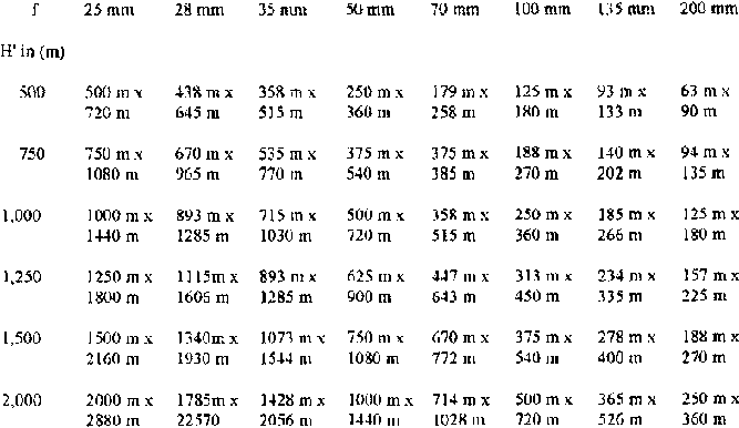 Table 6.2 below gives a guide to ground coverage with various altitudes and focal lengths . This is the actual area on the ground that will be captured by a 35 mm negative or slide diapositive of size 25 mm × 36 mm.