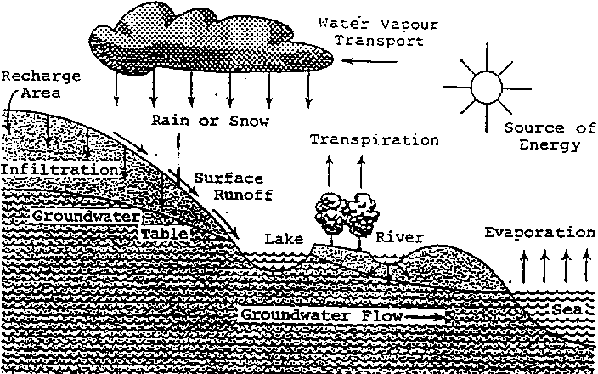 The hydrologic cycle (Figure 2.2) is easily understood: water evaporates from the earth's oceans and other water bodies, is carried by air currents, condenses due to temperature changes, falls to earth again as precipitation, and finally flows back to water bodies to begin the cycle over again.