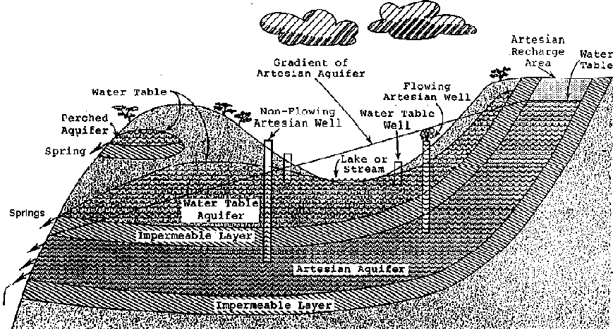 Unconfined or water table aquifers (Figure 2.3) have a free water surface. Confined or Artesian aquifers (Figure 2.3) are bounded by an impermeable or semi-impermeable layer that maintains the water in the aquifer under pressure. Wells in artesian aquifers may flow freely without the need for pumping.