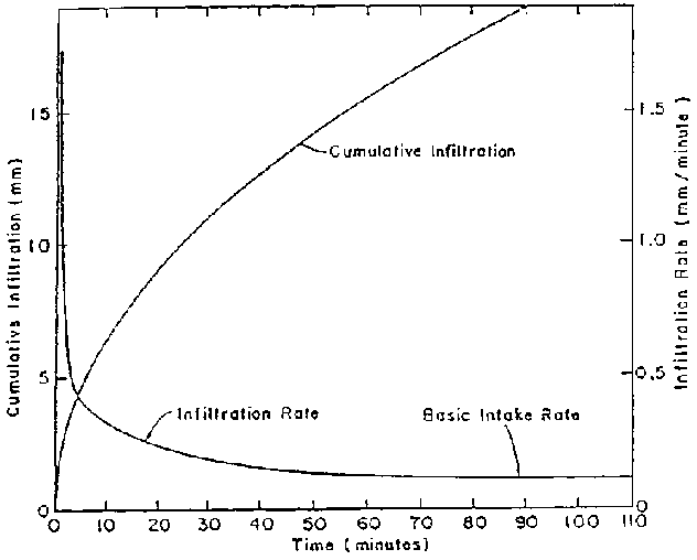 Many soils that are initially dry will absorb large amounts of water rapidly at first, but infiltration rates decline as the soil becomes wetter. Infiltration rates can provide an important clue as to the capacity of the soil to store moisture and the rate of runoff from a watershed.