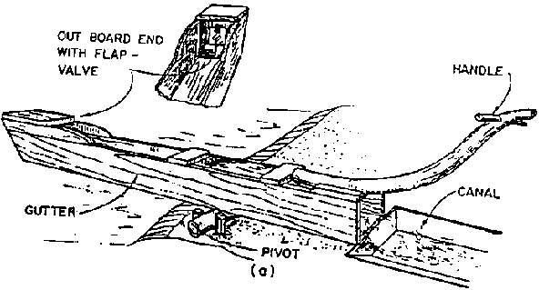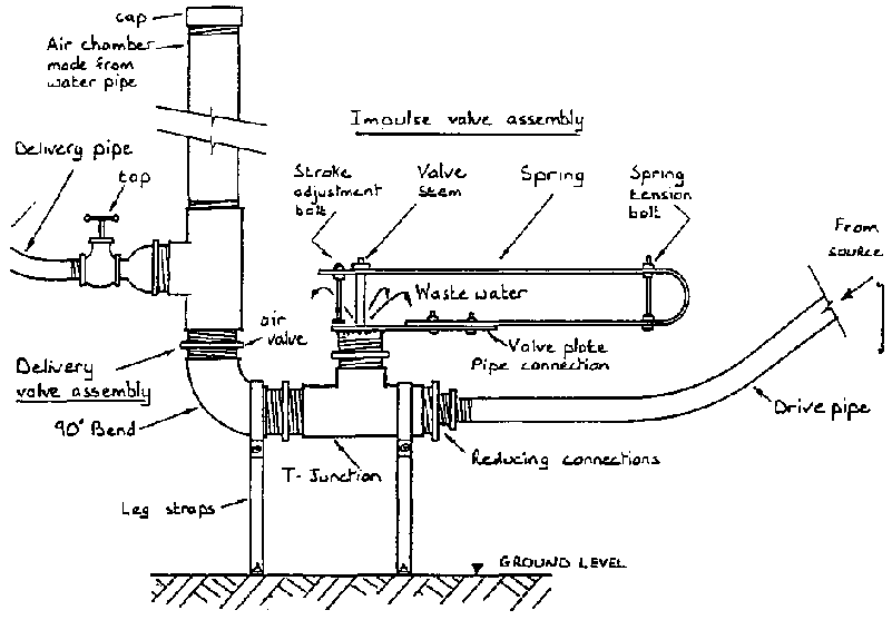 The hydraulic ram is a pumping device for lifting water to heights of over 100 m. It works solely on the power of falling water carried in a drive pipe. It is completely automatic and has an exceptional record of trouble-free operation. It can be constructed from commercial pipe fittings and adapts well to low input rural use. The disadvantage in the use of the hydraulic ram, in irrigation in particular, is the low water yields that it produces. Figure 3.37 shows the simple assembly of a hydraulic ram and the necessary building materials.