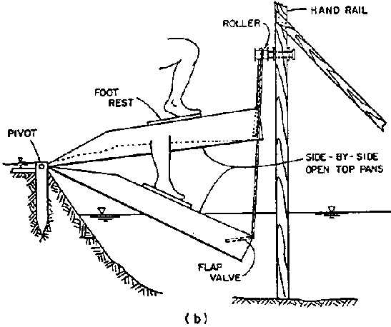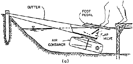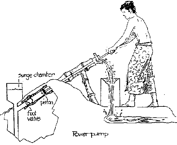 The Rower pump (Figure 3.25) is a reciprocating-action piston pump whose PVC cylinder is inclined at an angle of 30° to the horizontal. A unique feature of this pump is that it is fitted with a surge chamber at the pump suction. This absorbs the impact of the accelerating and decelerating column of water within the tube-well pipe and so provides a steadier upward flow of water. This in turn enables the operator to make easier and quicker strokes. A person can pump 50% more water in a given time using a pump with a surge chamber fitted. The addition of the surge chamber enables children (who would otherwise be too small to operate a conventional hand pump) to pump water quite easily. The pump is being used to irrigate small plots in Bangladesh and other countries.