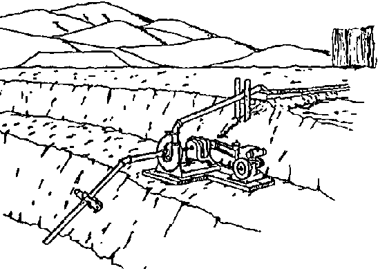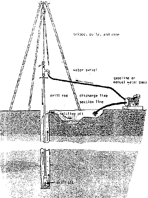 Wells may often be constructed by communities or individuals, without the need for commercial drillers. The three types of wells commonly encountered, which can be constructed relatively inexpensively, are the driven wells, hand augered wells, and hand dug wells. The description of driven and hand auger techniques that follows is extracted from "Appropriate Well-Drilling Technologies" by the National Water Well Association (Ref. 15). Sketches of other types of drilling equipment useful in drilling small capacity irrigation wells are included in Figures 3.38 through 3.44.