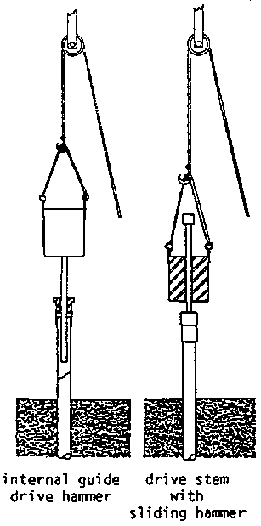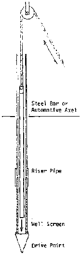 Whenever the water table lies at shallow depths (23 feet or 7 meters), a well screen equipped with a drive point may be driven through the overlying soil and into the water-bearing formation. This method employs a drive hammer. Three basic types of drive hammers are in common use: (1) the hand driver, consisting of a sliding weight and an attached pipe that fits over the riser pipe (Figure 3.38), (2) an internal driving bar, which strikes directly upon the driving point (Figure 3.38), or (3) a sliding weight and drive stem or guide that attaches to the uppermost riser pipe coupling (Figure 3.39).