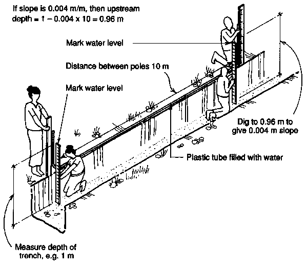 If surveying equipment is not available, a simple alternative is a long plastic hose filled with water (Fig. 18). Make sure there are no bubbles in it, and lift up both ends. The water level at each end of the hose will be the same. If a slope of, for instance, 0.4% (0.004 m/m) is desired, this means a difference in level along a 10-m length of drain of 0.004 × 10=0.04 m. If the hose is held so as to keep the water level 1.00 m above the bottom of the trench at the downstream end, the bottom should therefore be 0.96 m (1.00 - 0.04) beneath the water level at a point 10 m upstream. The same method can be used to check the level of the drain elements when they are laid, using a piece of string to check their horizontal alignment. A spirit level should be used to check the slope of individual elements.