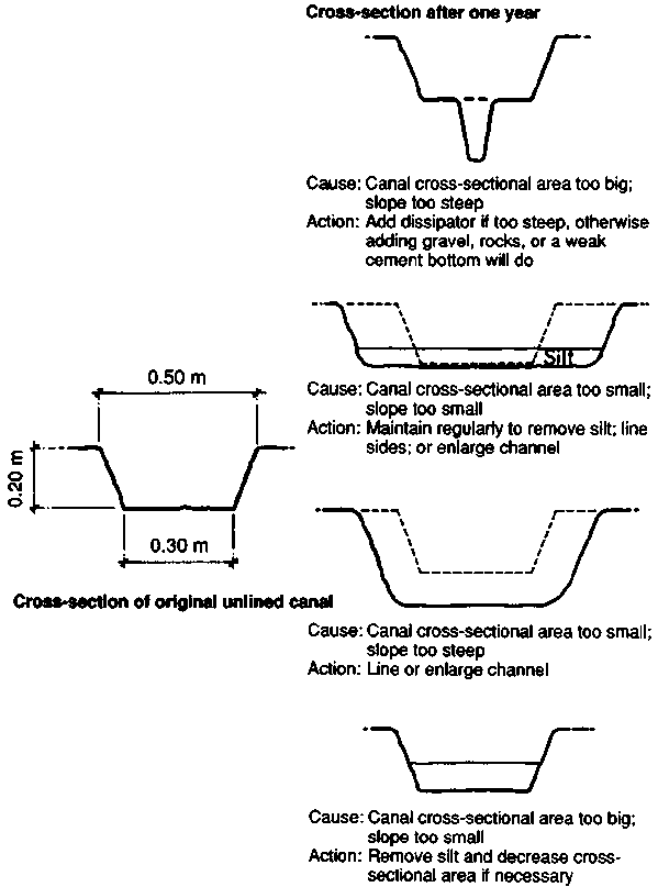 (l) Monitor the system's functioning during at least one wet season, noting areas of scouring, overflow, stagnant water, silt deposition, or other problems. Water will tend to erode and deepen a channel if it is too narrow and steep, and to deposit silt if it is too wide and the slope is insufficient. Fig. 21 shows some of the changes that can occur in a typical unlined channel, and how they can be used to diagnose the need for suitable measures.