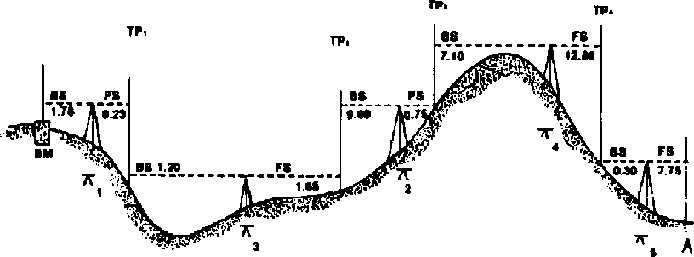 Figure 7-6 shows a survey that covers a longer distance where the elevations at several points between the benchmark, "BM" and a final point "A" are determined. A survey made in steps is required if there is a visual obstruction between the beginning and end points or when the difference in elevation is great.
