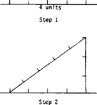 A right triangle is formed when the dimensions of the three sides of a triangle are in the ratio of 3:4:5 (ratios of 6:8:10, etc. are also useful). To form the right triangle, form a base of say 4 units of length (Step 1) (Figure 7-12). Then find the intersection of the other two sides, one of three units (at a 90° angle) and one of five units (Step 2). The resulting triangle will contain the desired right angle.