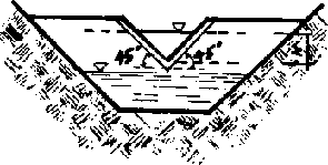 The weir may be made of sheet metal or wood. It must be well buried in the bottom and sides of the stream bank to prevent seepage. Posts and braces may be necessary to withstand the pressure of the water on the upstream side.