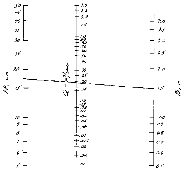 Figure 8-5 is a special type of chart called a nomograph showing the flow through a rectangular weir as a function of the depth, H. The coordinates on the chart are logarithmic scale rather than linear scale. Also, the flow is in cubic meters per second per meter of width.