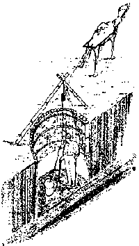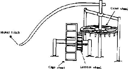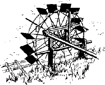 Where water tables are high, the Persian wheels are widely used to lift water from streams or from large dug wells. The wheels are usually animal powered. Figure 8-13 shows a schematic diagram of a Persian wheel, which can be, and usually is, constructed primarily of wood.