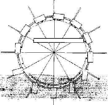 If the stream flow is large compared to the amount of water to be removed, a water powered wheel may be used, Figure 8-9. The large water "sails" furnish the power to raise the partially filled containers to the discharge point. Figure 8-10 is an additional detail diagram to how how pivoted buckets are tipped to empty them.