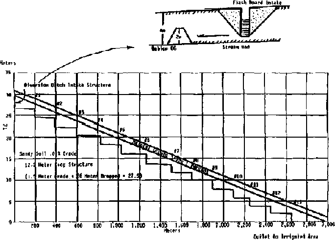 If the natural slope from the source to the point of use is very steep, it may be difficult to keep the velocity low enough to prevent erosion. A possible solution is to provide, at appropriate intervals, steps that will lower the water from one level to the next (Figure 9-5). The slope of the channel between the "steps" may be kept to a value that will prevent erosion. The steps may be made of wood or masonry materials. The flow velocity will be very high just below the structure and will cause severe erosion on the lower side. An apron must be provided to dissipate the energy in the falling water as shown in Figures 9-6 and 9-7. Table 9-4 shows the dimensions of a typical drop structure as shown in Figure 96(b).
