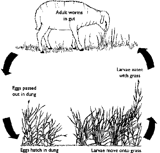 Most of the nematodes of importance lay eggs in the gut which pass out with the animals dung and develop into infectious stages (larvae) in the pasture. Animals become infected during grazing.