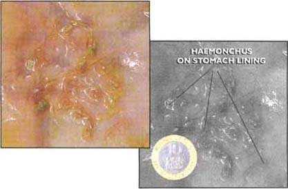 HAEMONCHUS. This worm lives in the stomach of sheep, goats, cattle and camels. It is large enough to be seen at slaughter without a magnifying glass. It sucks the blood of the animal and if present in large numbers, can cause a rapid depletion of the animal's blood reserves. In sheep, goats and camels it can be fatal if present in large numbers or if the animal is poorly fed. It is also a very prolific worm, laying many thousands of eggs, so build up of infection in a flock can be fast. In heavy infections, the animals become dull, thin, have very pale membranes around the eyes and inside the mouth and may develop "bottle jaw" - a pendulous swelling below the lower jaw. In camels this watery swelling is often seen above the eyes and each side of the sternal pad. When pasture is heavily infected, animals may die before showing clinical signs and before the onset of worm egg-laying. Haemonchus does not usually cause the animal to have diarrhoea.