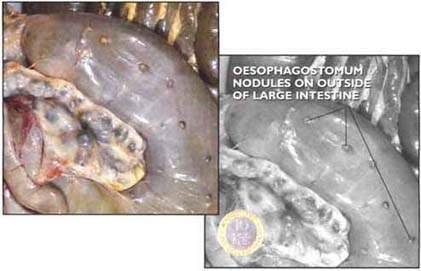 OESOPHAGOSTOMUM. This worm lives in the large intestine where it causes formation of nodules. Both the nodules and the worms themselves are large enough to be seen at slaughter, but the occurrence of large numbers of hardened nodules is diagnostic. Apart from the loss of value in matumbo, large infections of Oesophagostomum can be a cause of scouring.