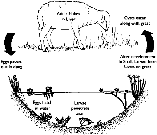 All the flukes of importance to livestock have indirect life-cycles with adults in the domestic animal and intermediate stages in various species of water snails.
