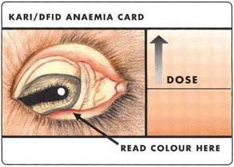 KARI/DFID ANAEMIA CARD For more information refer to the KARI/DFID Manual of Integrated Helminth Control. This card is designed to help in the diagnosis of liver fluke and haemonchosis in sheep. In certain areas other diseases may cause anaemia. 1. Open the eyelid by pushing gently down on the upper eyelid with one thumb while the other thumb gently pulls the lower eyelid downwards. Produced by the KARI/DFID NARP II Project, c/o KARI, Box 57811, Nairobi, Kenya. |