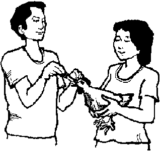 The application of solid preparations through the mouth is called "force-feeding". It is used for ruminants, swine and poultry. The procedure is similar to that for drenching. After you have put the solid medicines into the mouth, make sure that the animal swallows them. In ruminants, this can be done by massaging the throat. An easy way to force-feed animals is to put solid medicines either into a banana or cooked sweet potatoes and feed this to the animal.