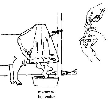 Drop medicine directly into the nostril or apply it as vapor as shown in the illustrations. This is used in all species.