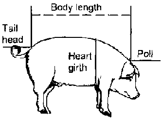 Live weight of swine can be estimated by measuring the body length (from the back of the head to the tail head) and the heart girth of the animal with a tape measure. Using the table below, an approximate weight can be calculated. For example, if the body length is 130 cm and the heart girth 110 cm, the swine weighs about 105 kg.