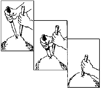 Wash these thoroughly with soap and clean water. Disinfect the knife by heating it over a fire and cool it before use. Hold the knife in one hand and the bamboo in the other. On the left side of the animal, stab the highest point of the swollen (bloated) part with the knife. Push the knife blade all the way into the hole. Remove the knife and immediately insert one end of the bamboo into the hole. Gas will come out through the tube. Release the gas for 30 minutes. Then, pour a mixture of 300 ml vegetable oil and 30 ml of turpentine oil into the bamboo tube. The mixture of oil will break up the bubbles in the rumen which cause the bloat and help prevent its recurrence. Remove the bamboo, and the wound will immediately close and heal on its own because the skin of the animal is tight. However, to avoid possible infection, you may apply powdered charcoal, fresh from the stove and cooled.