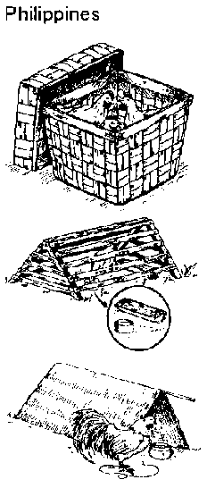 For their fighting cocks, farmers in the Philippines build a shelter of two planks of wood. The cock can perch on the bamboo or wooden rod attached to the top of the shelter. A rope around its leg prevents the bird from flying away. A feeder and waterer are placed inside the shelter.