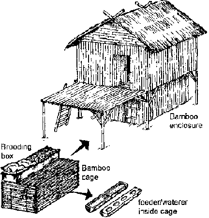 This bamboo cage can house five adult birds. It is placed on the ground underneath the farmer's house and the whole area under the house is enclosed by bamboo walls. The birds can go in and out through the opening and through the door in the enclosure. Bamboo troughs (made by splitting a large bamboo in half lengthwise) are put inside the cage to hold feed and water