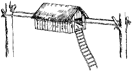 Two wires are strung between two trees, 3-6 m above the ground. A small poultry shelter for about five birds is placed on the wires. During the day, the birds forage about outside. When a predator approaches, the birds hop up the rope ladder into the shelter. During the night, they go back into the shelter and the ladder is tied up. It is let down again in the morning.