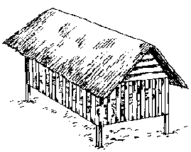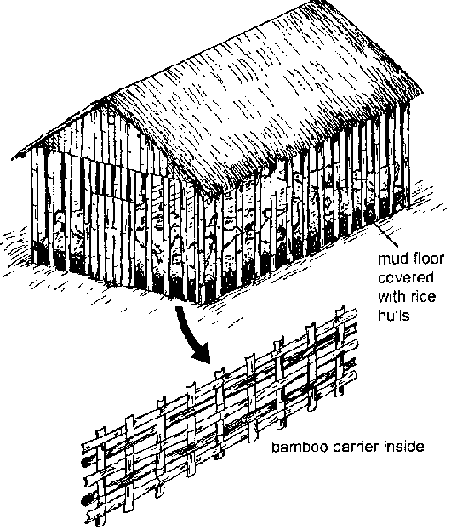 This house is built of wood or bamboo, with a roof of thatched grass. A house measuring 4m × 8m can hold 250300 chickens. On the floor inside the house, farmers put a 10 cm layer of mud. On top of this, they put a 3-5 cm layer of rice hulls. They change the bedding once every two months. Barriers of woven bamboo, 50 cm high, run lengthwise down the house. The hens are let outside to forage during the day.
