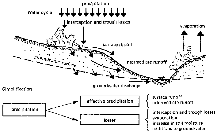 The residual precipitation, the greatest part of which does not run off, is referred to as loss and is subdivided into the following components: