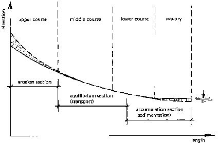 In the interplay between the tractive force of the water and the resistance of the bottom material, each stream is subject to changes. These are shown in simplified form in Fig. 16 for a longitudinal river section.