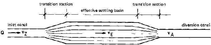 It is the purpose of the sand trap to remove the fine-grained suspended matter from the water and to protect the components. This is achieved most simply by allowing the suspended matter to settle in the settling basin or a long sand trap. This is done by slowing down to a low velocity the amounts of water distributed as evenly as possible over the cross-section of the basin. The time of passage through the basin must not be shorter than the settling time of the suspended matter. These boundary conditions require long structures suitably shaped from the hydraulic point of view (cf. section 5.3).