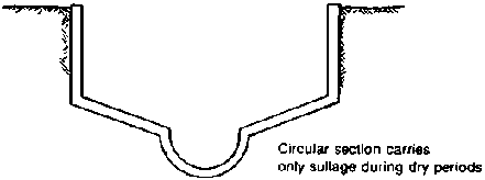 Storm drains that are also used for transporting sullage should have a compound cross-section as shown in Fig. A2.1. This is because the flow of stormwater in the rainy season can be hundreds of times larger than the flow of sullage alone. A simple cross-section designed only for stormwater would conduct the sullage away at a very low velocity, leaving the solids suspended in the sullage in the bottom of the drain. The circular channel in the invert of a compound cross-section allows small flows to move at a higher velocity. Drain-cleaning tools should be adapted to fit the small central channel.