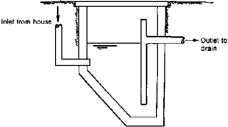 Small-bore sewers can be used to convey sullage. Diameters and slopes can be less than those recommended for sewage containing excreta because the solids load is less. Where sand is used for scouring cooking pots it may be necessary to install traps to collect this grit before it goes into the sewer. However, attention must be given to ensuring that these traps are emptied periodically - the mere provision of them without adequate maintenance is not enough. There may also be a risk of grease deposits building up in the pipes. Grease traps can be used to separate grease from the rest of the wastewater, but they are only effective if the accumulated grease is removed at regular intervals. Generally, grease traps are fitted at garages, restaurants and other commercial premises where large quantities of oil or grease are discharged in the wastewater (Fig. A2.2).