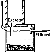 aqua-privy · Latrine in which excreta fall directly through a submerged pipe into a watertight settling chamber below the floor, and from which effluent overflows to a soakaway or drain.