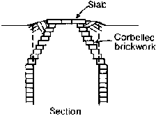 corbelling · Construction in which bricks, blocks or stones are built so that an upper course projects inwards beyond the course below to support a load, such as a manhole cover or squatting slab.