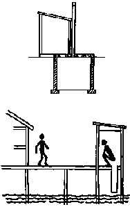 overhung latrine · Latrine sited such that excreta falls directly into the sea or other body of water.