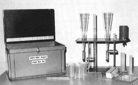 A special vessel without turbidity reading equipment is required for the described test procedure. A simpler test with three beaker sand some fine plastic tubes can be carried out in case a commercial turbidity meter requiring small water volumes (about 25 ml) for turbidity readings is available.