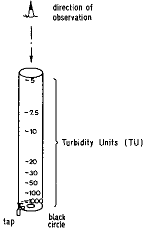 Turbidity is measured by a test tube that has been developed by DelAgua and which is included in a field test kit for bacteriological (faecal coliforms) and physical/chemical analysis (pH, conductivity, chlorine). More information on this field test kit can be obtained from DelAgua, P.O. Box 92, Guildford GU2 5TQ, England [7]. SANDEC has adapted the turbidity test tube by the addition of a small valve which makes turbidity readings simpler (drainage of the filled test tube until the black circle appears instead of a stepwise tube filling until the black circle disappears).