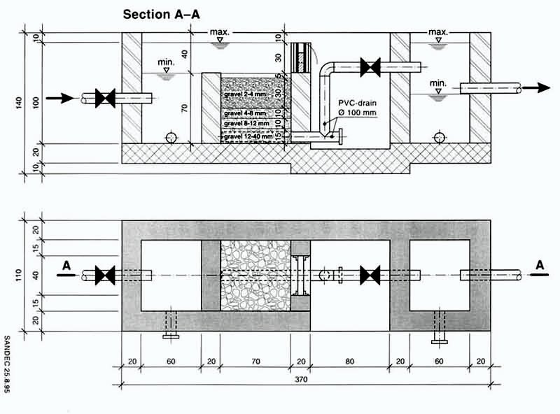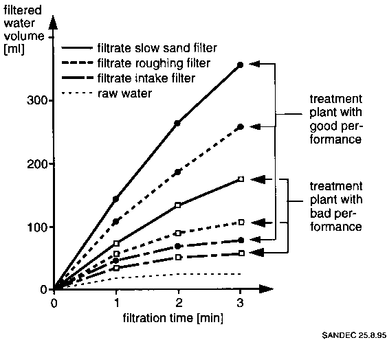 - plot the recorded filtrability values of the different water samples in relation to time (min) on a graph as shown in Fig. 1/1 as it enables the solids removal efficiency of the different treatment stages to be determined; water to be treated by slow sand filtration should have a filtrability value of at least 200 ml/ 3 min. and the filtrate of slow sand filters a value of 300 ml/3 min.