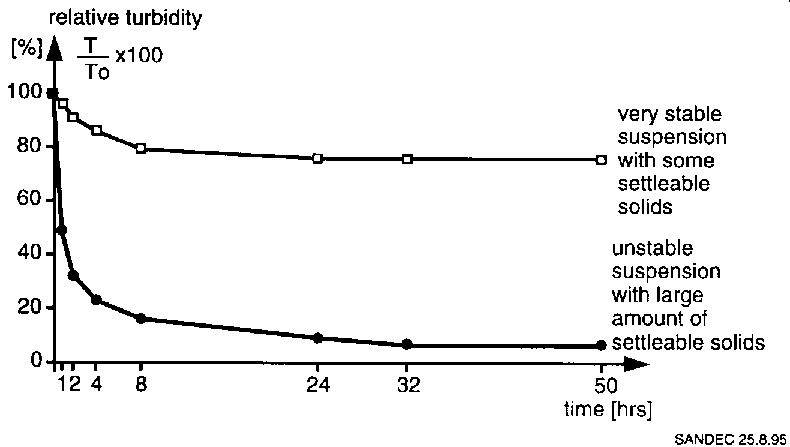 The stability of a suspension and settling properties of the suspended matter can be determined by a sedimentation test. Recording of turbidity decrease in relation to time is the simplest monitoring procedure for such a test. The water sample must be kept undisturbed during the test period. Therefore, small water volumes are extracted carefully and the turbidity measured in a common turbidity meter or by the turbidity test tube described above which, however, gives less accurate results.