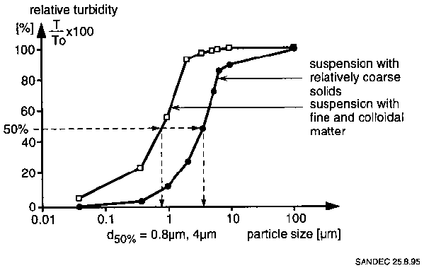 - plot the recorded turbidity values in relation to the filter pore sizes on a graph as shown in Fig. 1/3. It will reveal the particle size distribution of the analysed suspension.