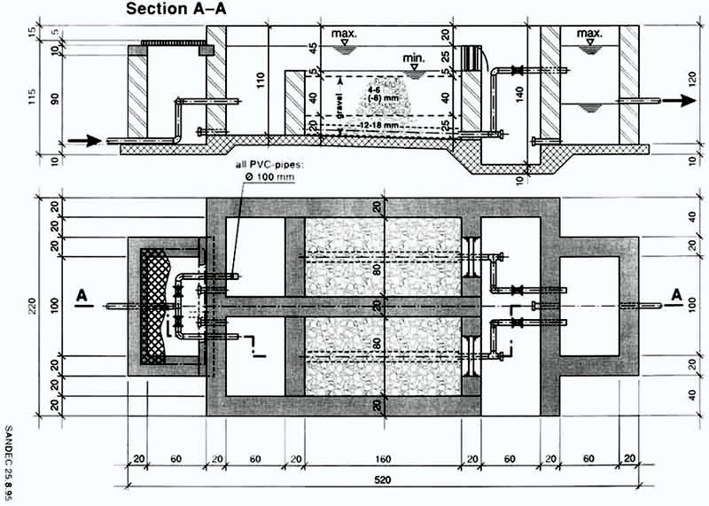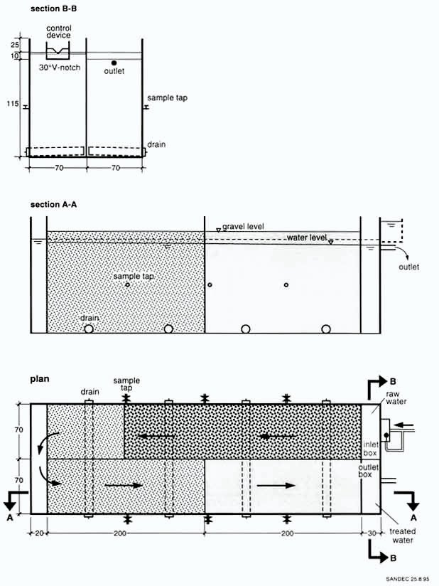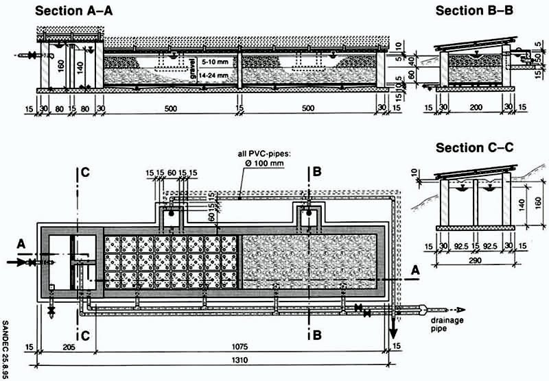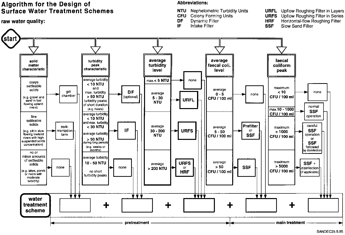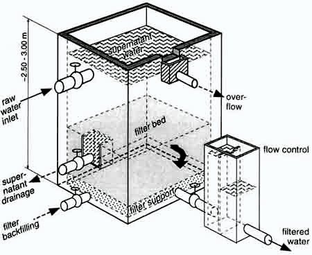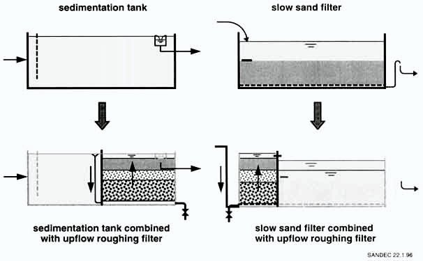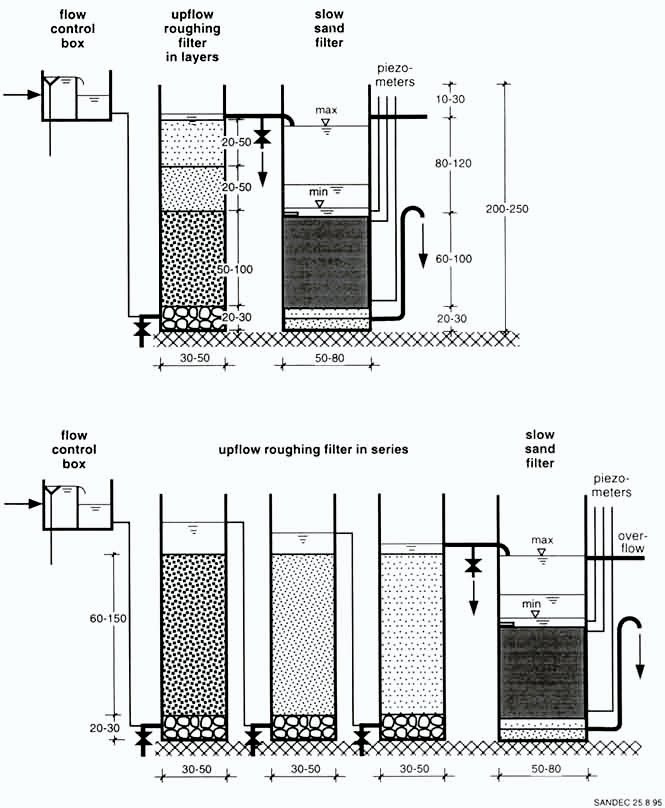 Surface water treatment generally requires at least two treatment steps. The first step, also called pretreatment, concentrates mainly on the removal of solids. Prefiltration by roughing filters is a simple and efficient process for solid matter separation. However, roughing filters also contribute to a bacteriological water quality improvement. The second step, commonly considered as main treatment, is applied especially to remove or destroy the remaining microorganisms by slow sand filtration and chlorination.